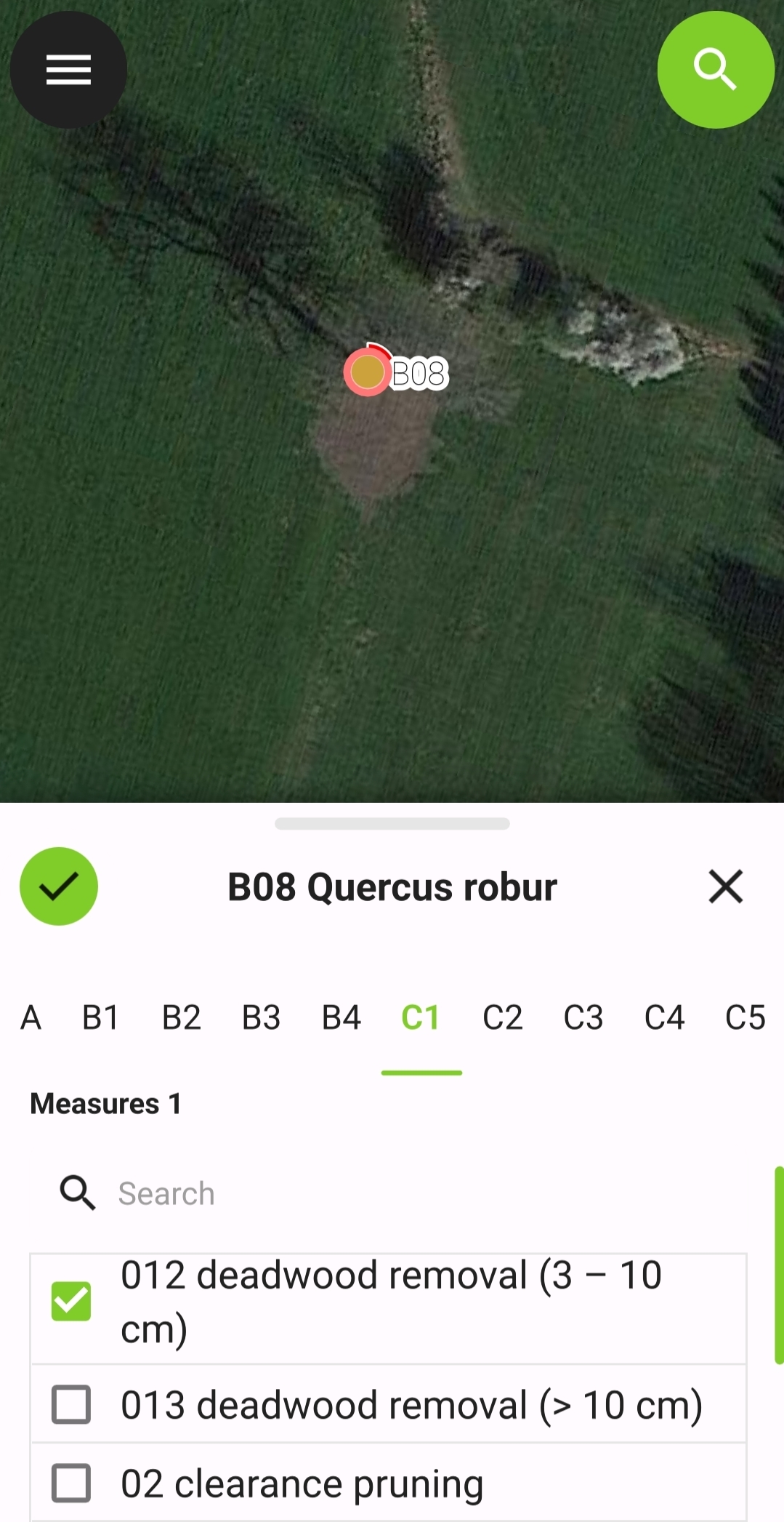 - Formulár na kontrolu stromov (prispôsobiteľný): Základné údaje (druh stromu, výška, šírka koruny, priemer kmeňa atď., charakteristiky/poškodenie koruny, kmeňa, základne kmeňa, koreňovej sústavy, okolia, opatrenia podľa ATTC-Tree-Care)